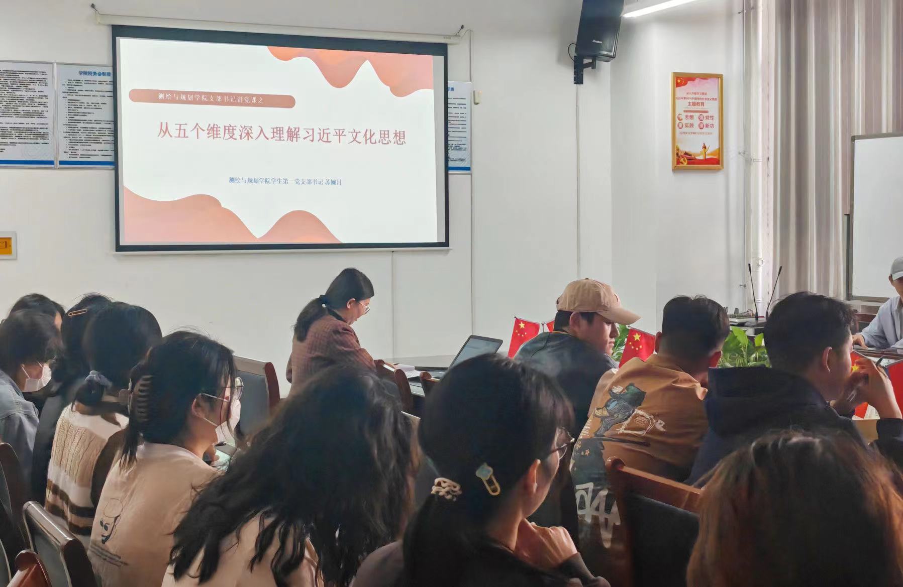 4月12日,学生第一党支部书记苏婉月以《从五个维度深入理解习近平文化思想》为题讲授了党课。党的十八大以来,以习近平同志为核心的党中央立足党和国家事业发展全局,把文化建设摆在治国理政的突出位置,围绕新时代文化建设提出了一系列新思想新观点新论断,内涵十分丰富、论述极为深刻,是推进新时代文化建设的总方针、总遵循、总要求,我们要持续加强对习近平文化思想的学习、宣传、研究、阐释,自觉贯彻落实到宣传思想文化工作全过程各方面。