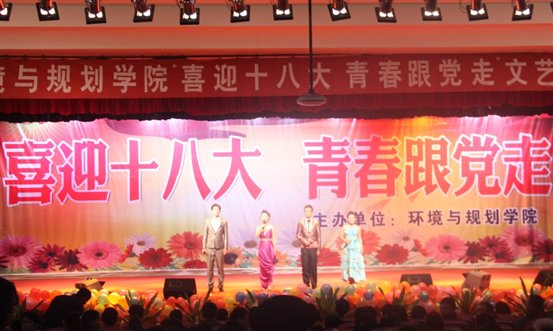 为喜迎十八大的胜利召开,11月4日晚,环境与规划学院在文化路校区大礼堂隆重举办“喜迎十八大 青春跟党走”文艺晚会暨周未文化广场活动。副校长程印学、蒋志民,工会主席李中华出席了晚会,校党委宣传部、学生处、团委、部分学院负责人与环境与规划学院全体师生一同观看了演出。