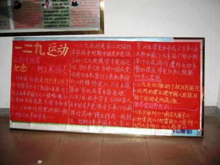 今天是第73个“一二.九”运动纪念日,环境与规划系师生以多种形式纪念这一节日。 在12月9日到来之前,环境与规划系各个教学班纷纷以“一二.九”运动为主题制作了主题板报。系学生会也以在系教学楼入口展出展板等形式迎接“一二.九”运动纪念日的到来,提醒全系师生铭记历史勿忘国耻。晚上,环境与规划系全系学生在文化路校区文工团集体观看了电影< 黄石的孩子>,把同学们带到那个战争的年代,在这个特殊的日子里,激发了大家的爱国热情,让同学们受到了一次深刻的爱国主义教育。
