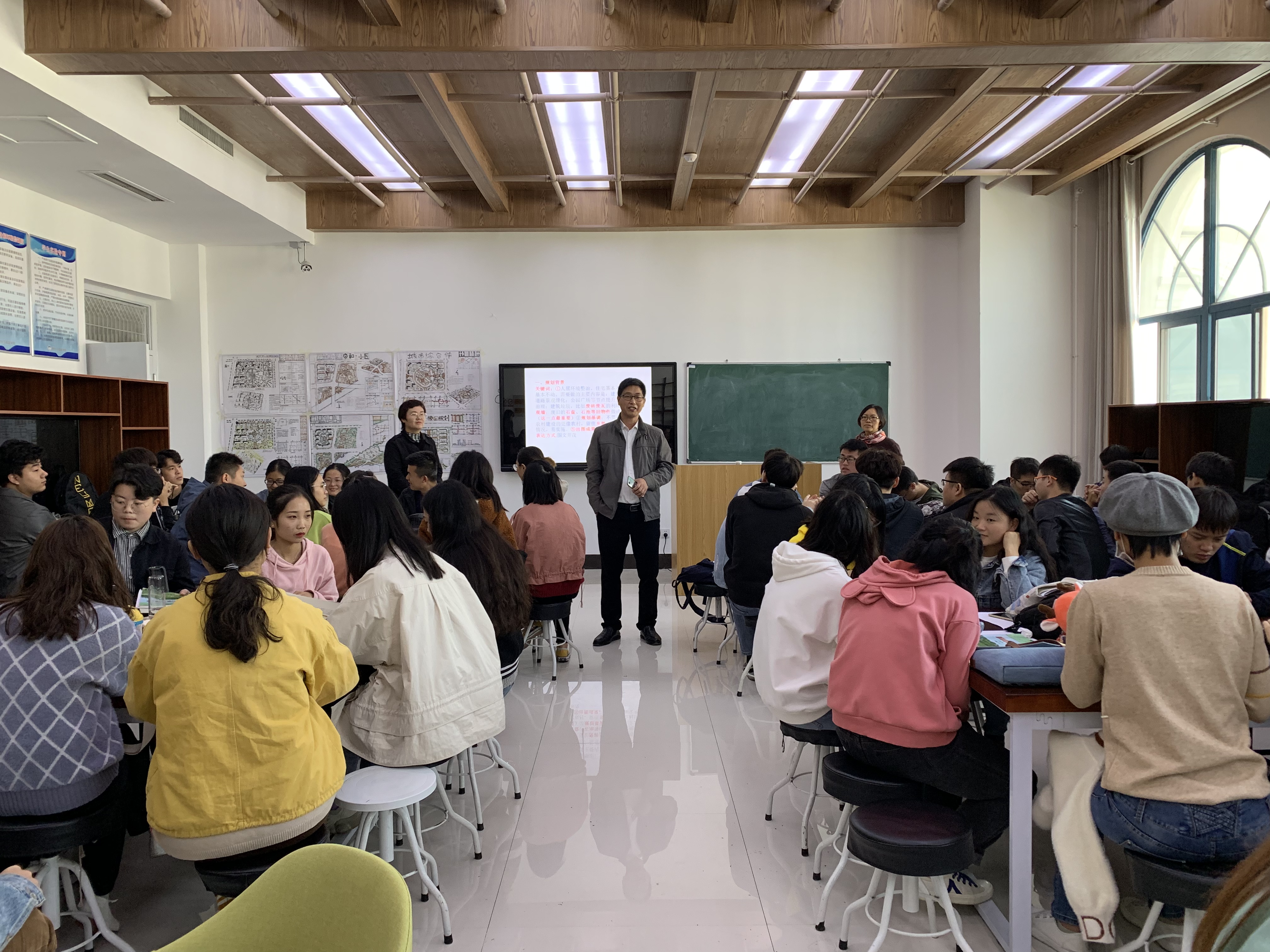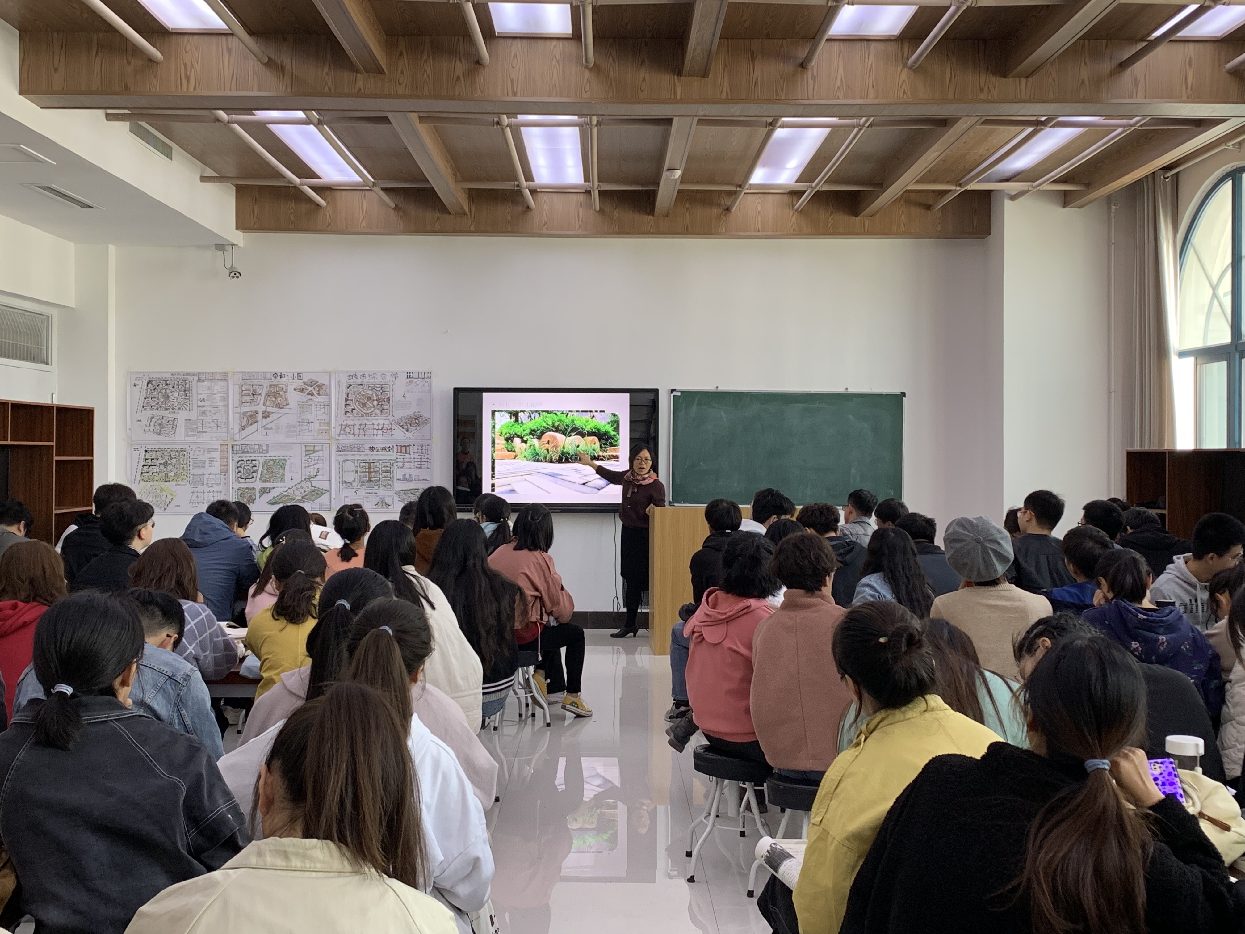 随后,杨贵玲老师给大家讲述了此次课程设计背景及要求,从“规划背景、评分标准、作业要求、学习方式”四个版块对本次课程设计的具体流程和要求进行了详细阐述,明确了城乡规划专业同学做前期广场和公园的平面布局等宏观设计,园林专业同学负责植物配置和景观墙等细节的设计,并确定本次规划基调:不要高大上,把农村建设的更像农村,留住乡愁;要结合村庄的情况,易实施。而侯颖老师开头以一张英国乡村景观图引发学生思考:究竟如何将中国乡村环境特色体现出来,接着她从乡村植物的经济性、乡土性、特色性、功能性四个方面解释了乡村景观营造原则,为两个专业学生开展本次课程设计提供了知识理论支持。