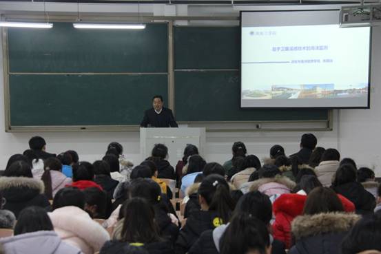 焦教授从建设海洋强国的国家政策谈起,详细介绍了全球海洋的分布特征、智慧海洋建设的重要性以及海洋遥感监测的优势,并通过大量国内外海洋遥感监测的具体实例,让学生深刻认识到遥感技术在海洋资源开发、海洋经济发展、海洋生态环境保护以及国家海洋权益维护等方面的重要性。随后,焦教授对遥感模型的尺度、定量遥感的病态反演、多源数据的同化三大前沿问题进行了阐述。随后,焦教授介绍了淮海工学院的基本情况以及学校硕士研究生招生的优厚条件,并希望同学们好好学习,为海洋建设贡献自己的力量。