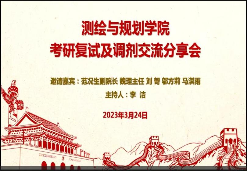 为帮助2023届考研考生更好地应对研究生复试及调剂问题,ballBET贝博BB艾弗森于3月24日举行2023届考研复试及调剂经验分享会在线会议。本次会议由李洁老师主持,参与学生114人,邀请嘉宾为副院长范况生、学工办主任魏理以及2022届上岸的三位优秀校友:测绘工程专业刘哿,地理信息科学专业邬方莉和城乡规划专业马淇雨。