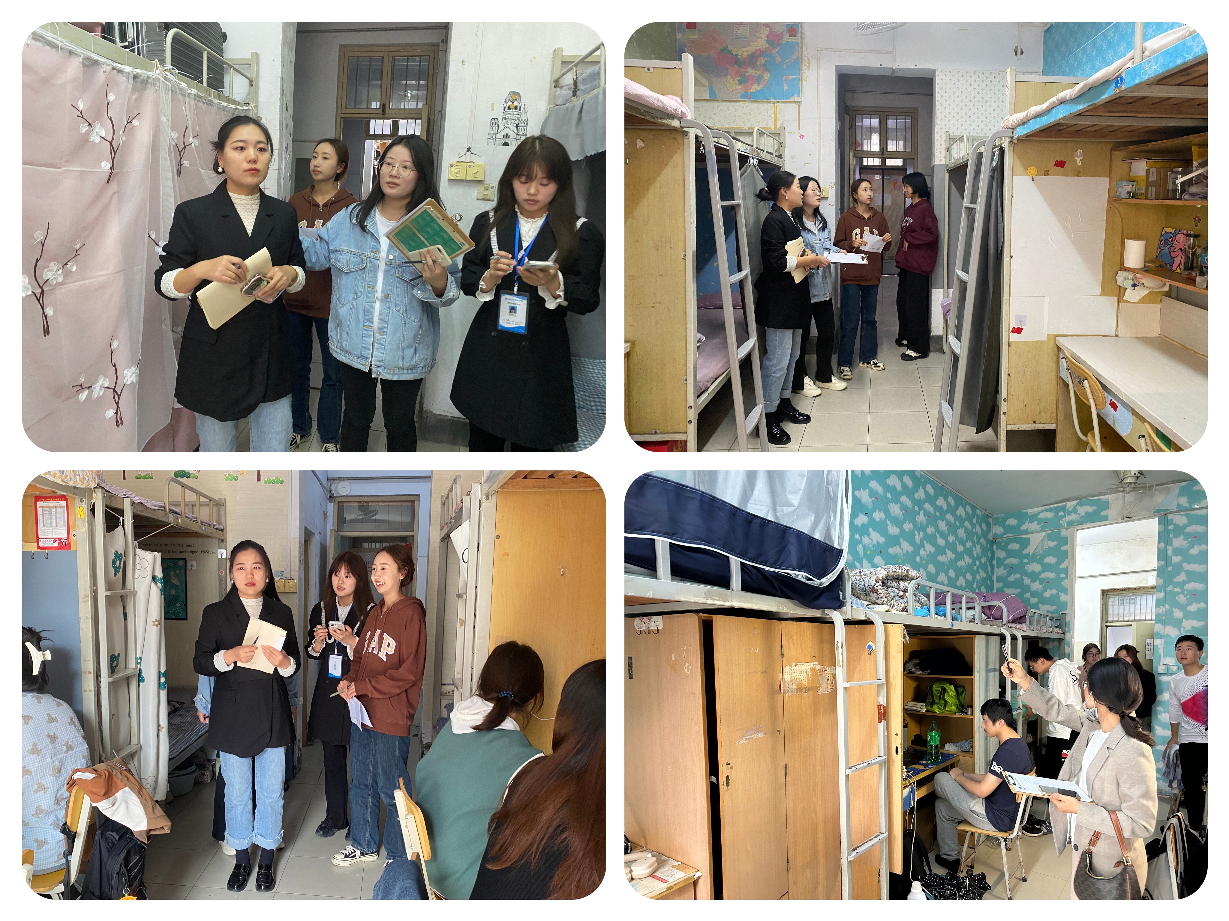 查访过程中,大家深入学生宿舍,重点围绕学生宿舍卫生状况、装饰亮点、有无安全隐患等开展了针对性检查并对所有2023级宿舍进行打分。通过检查发现,学生宿舍安全卫生整体情况良好,大一学生宿舍认真准备、精心装饰、各有特色,布置出一间间温暖舒适的宿舍,充分展现出大一新生积极向上、热爱生活的青春风貌。