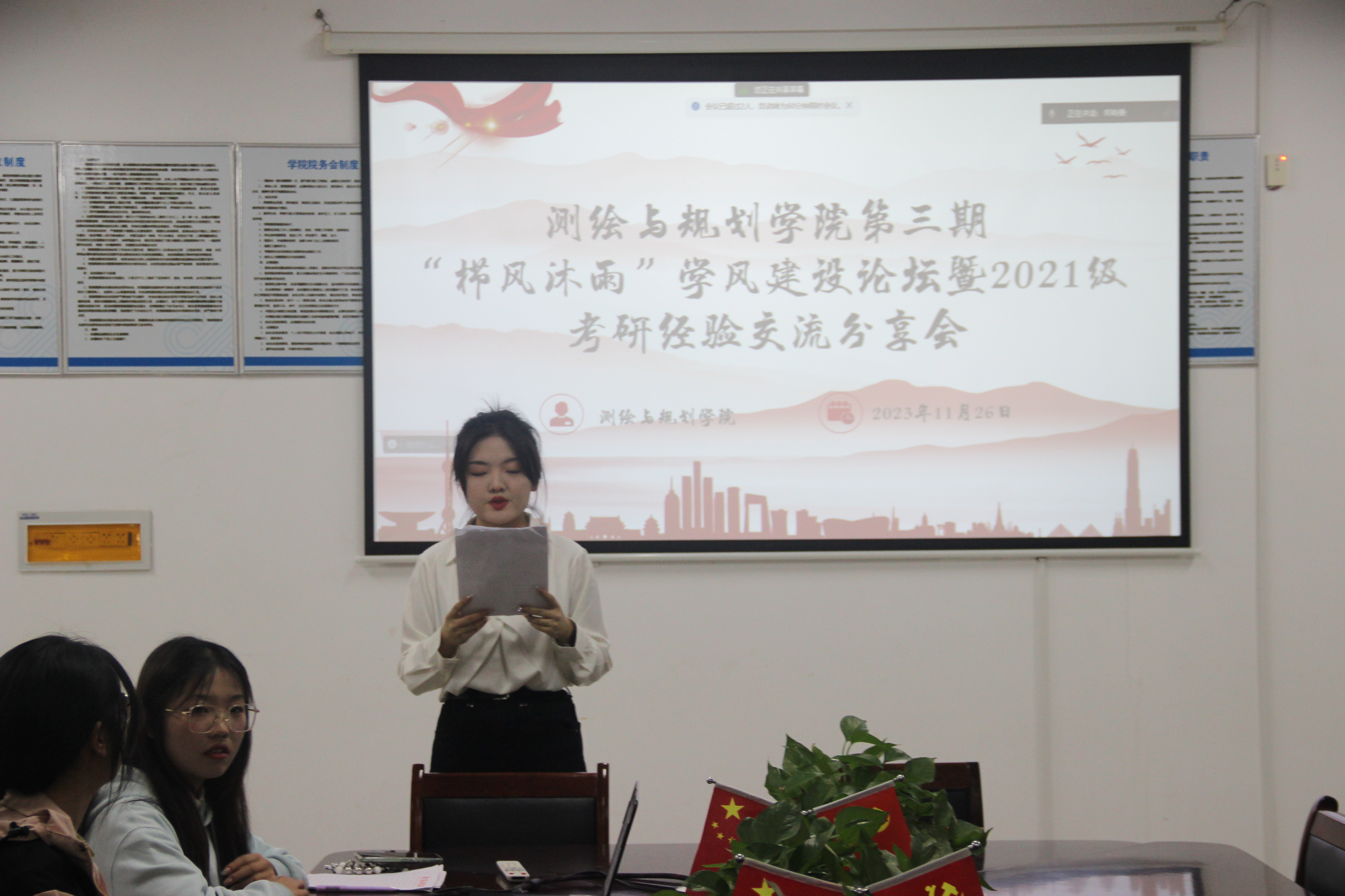 为充分调动贝博官网学生考研积极性,营造浓厚的考研氛围,帮助学生科学备考,提高学习成效。11月26日,测绘与规划学院通过线上线下相结合的方式举行“栉风沐雨”学风建设论坛暨2021级考研经验交流分享会。会议邀请4名2023届优秀考研学生代表分享考研经验,学院学习部,以及2021级测绘工程专业、地理科学专业学生代表参加会议。会议由张萱宇主持。