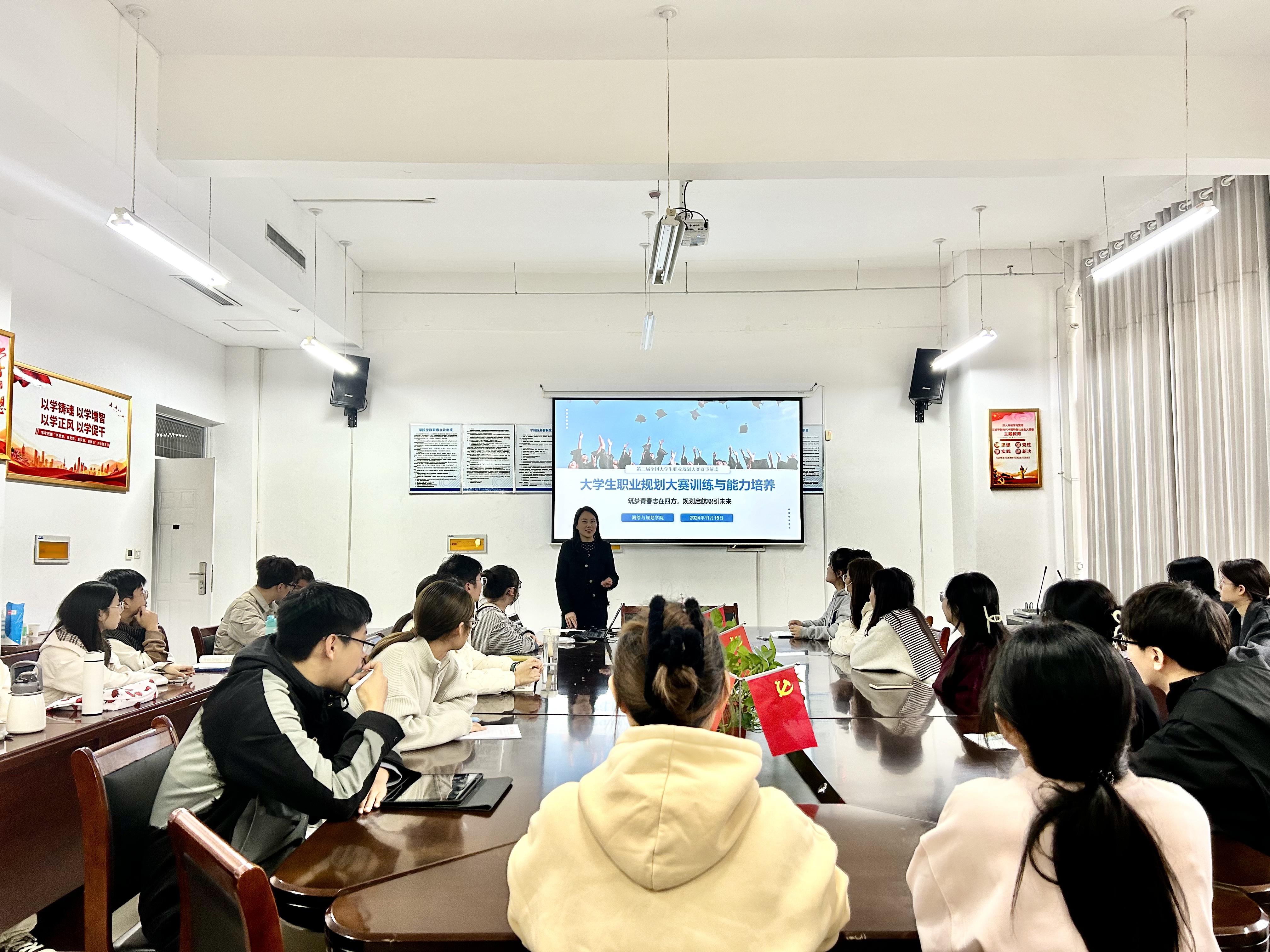 会上,王昊昊详细介绍了全国大学生职业规划大赛的背景、目的和重要性,并深入解读了评审标准、评分细则、撰写技巧等。张萱宇和曾哲同学分别从成长赛道和就业赛道分享了自己在职业定位、比赛探索、行动成果、评估调整等内容,以亲身经历分享参赛经验和职业规划的心得。