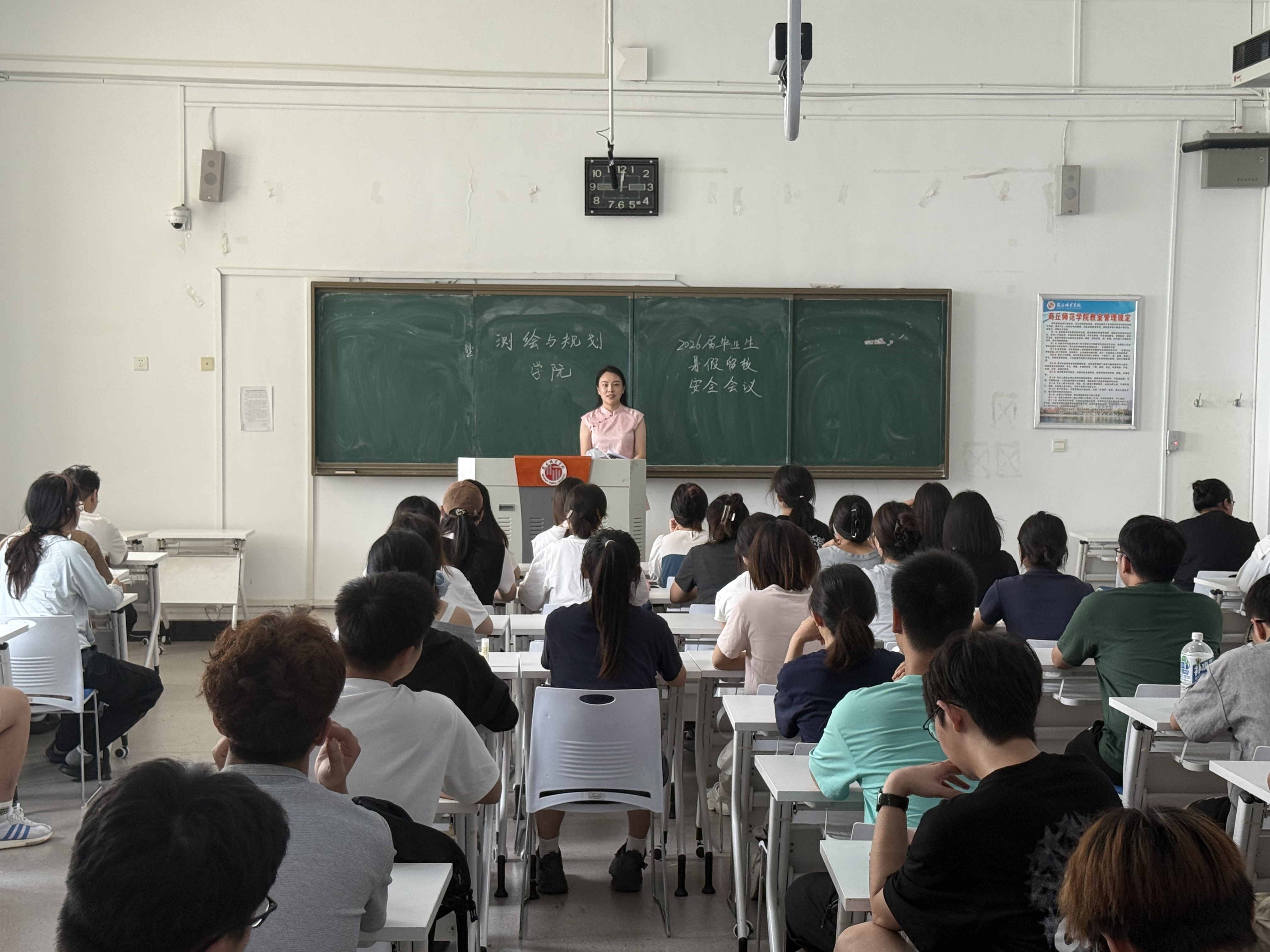 王昊昊首先介绍了暑期留校学生的总体情况和管理安排,强调了学院对留校考研学生安全稳定工作的高度重视,并对留校考研学生提出三点要求:一是安全责任重于泰山,全体学生需严格遵守宿舍管理规定,防范火灾、盗窃及网络诈骗;二是注意防暑降温、饮食卫生和出行安全;文明上网,维护意识形态安全;三是学院将严格落实暑期值班制度,保障餐饮、自习室等生活学习需求,为考研学生提供便利支持。同时,王昊昊叮嘱同学们要劳逸结合,保持身心健康,以最佳状态备考。同学们纷纷表示,将严守规定,互帮互助,珍惜暑期时间全力备考。