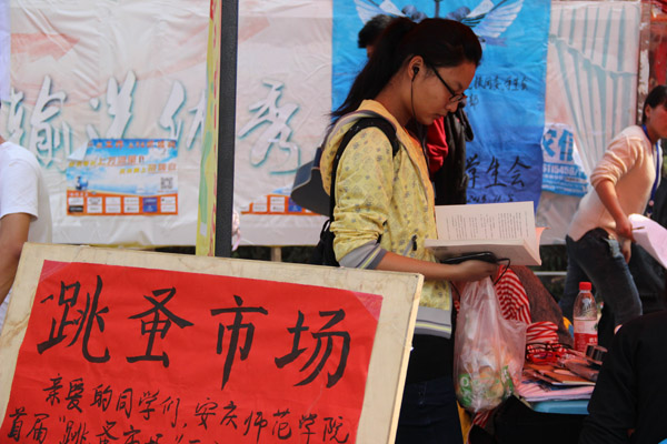 人声,车声,叫卖声,声声入耳;书摊,包摊,百货摊,摊摊大热。11月9日,龙山校区安苑和银苑食堂前的空地上搭起了数个棚子,这里人声鼎沸,热闹非凡,为期三天的首届大学生跳蚤市场正在这里举行。