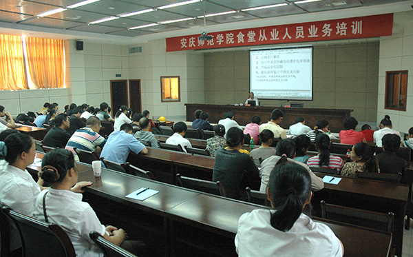 9月20日下午,beat365官网在龙山校区行政楼一楼会议室举办了食堂从业人员培训班,安庆市食品药品监督管理局阮宏广同志作了“餐饮安全就在我们手中”的讲座。后勤管理处全体工作人员、食堂从业人员参加了培训。