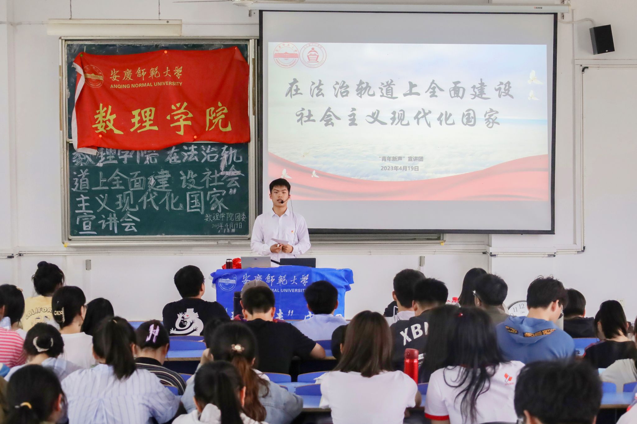 4月19日,校“青年新声”宣讲团在C208教室以“在法治轨道上全面建设社会主义现代化国家”为主题,面向数理学院“青马班”学员、入党积极分子、入团积极分子等开展宣讲活动,学习贯彻党的二十大精神,普及法治知识。