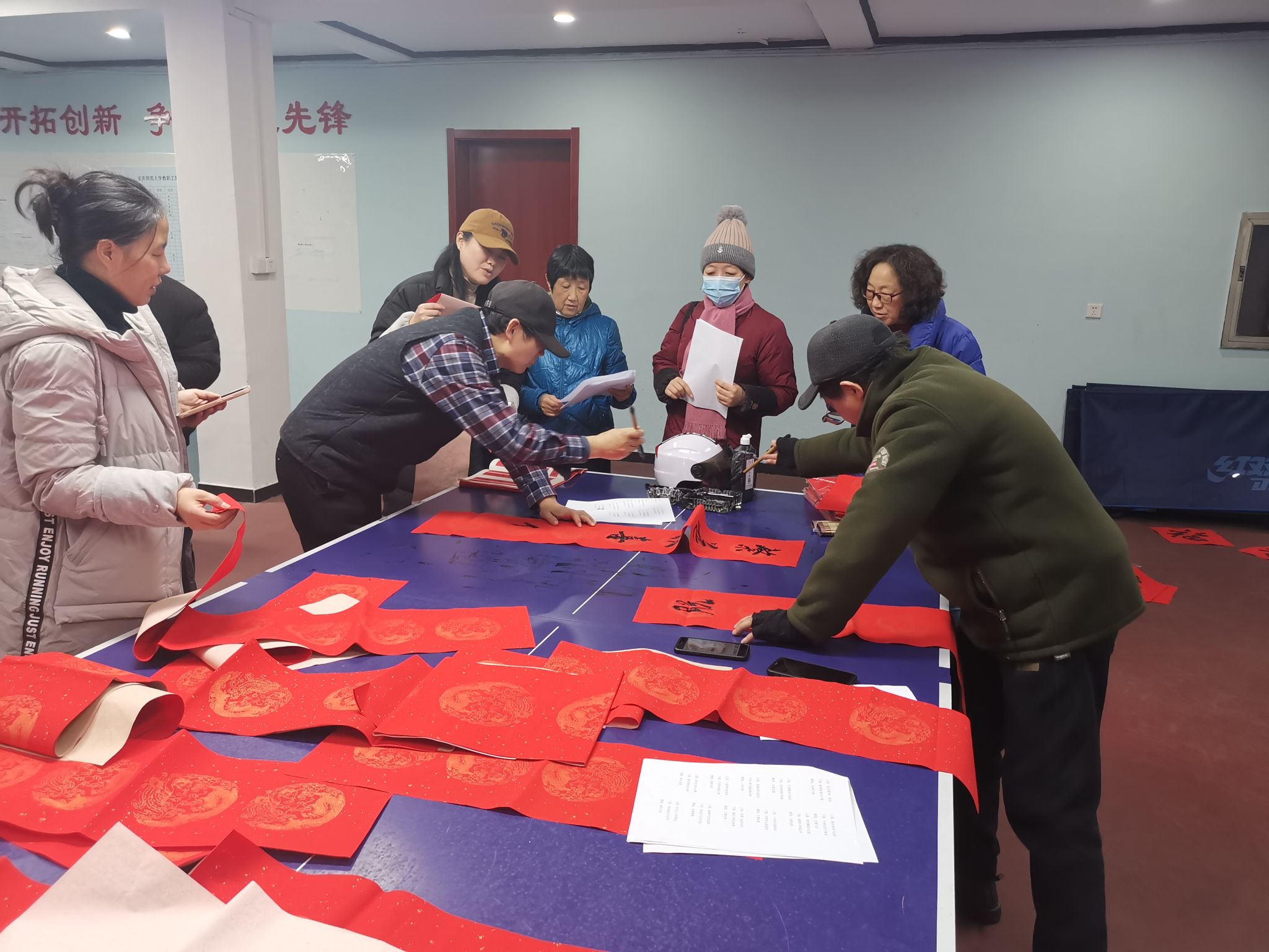室外阳光煦暖,室内欢乐祥和。活动现场人头攒动,热闹非凡,大家脸上洋溢着幸福的笑容,前来领取、订制春联的教职工络绎不绝。受邀来到活动现场书写春联的老师们欣然命笔,或厚重方峻,或流畅飘逸;或隶体,或行草,笔墨间龙飞凤舞,文字中,挥洒出对新年的期待、祝福和美好愿景,一副又一副寓意吉祥的春联,表达了广大教职工对美好的新春祝愿,营造出祥和温暖的节日氛围。