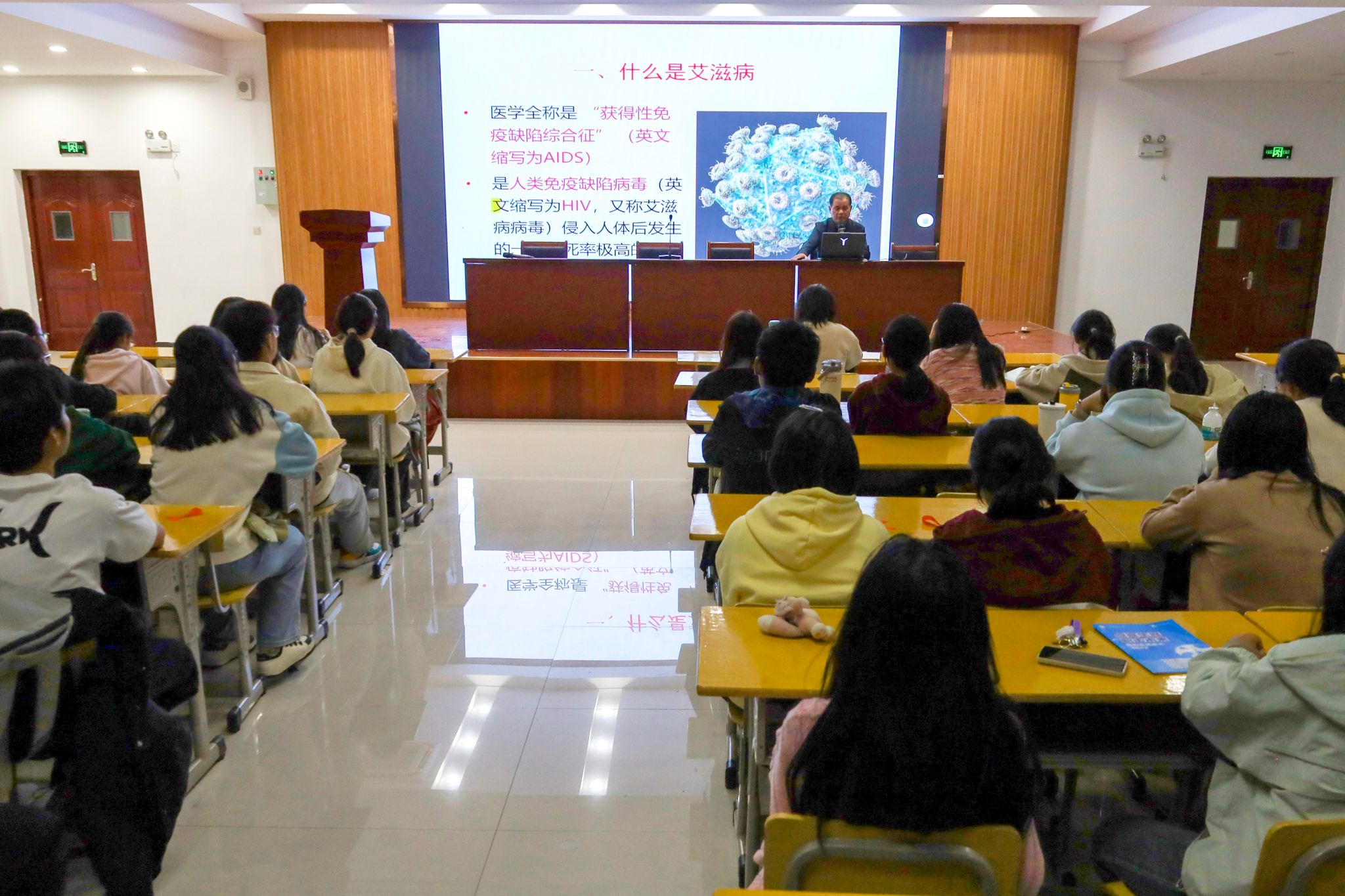 “近年来,我国的艾滋病病毒新发感染越发呈现年轻化趋势,学生群体逐渐增多。”校医院院长曹必宏从艾滋病的国情出发,结合真实案例,为学生详细介绍了艾滋病的起源与治病机理。