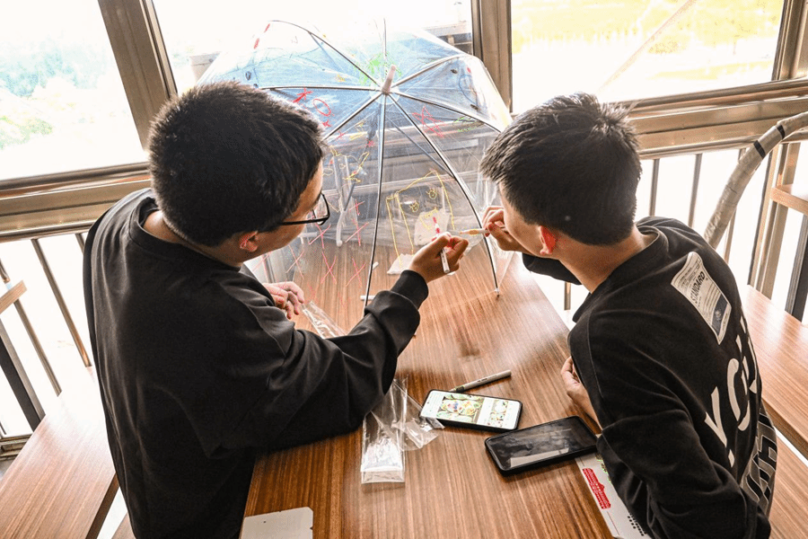 同学们围坐在一起,撑开雨伞,拿起画笔,绘制各式图案,并涂上自己喜欢的色彩,朵朵绚丽的“鲜花”在同学们的手中绽放。彩虹弯弯,色彩鲜艳;点点雏菊,小巧淡雅;郁金香花丛,繁茂生机;小兔子、大熊猫等一系列卡通人物,活泼可爱……在创作的过程中,同学们不时互相交流着绘画的心得,欣赏彼此的画作。同学们还在雨伞上写下美好寄语,表达对生活和学习的勉励与鼓舞。