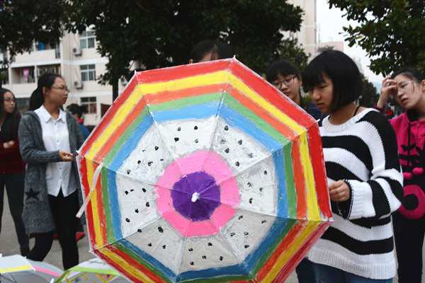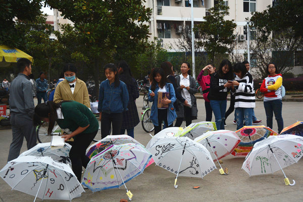 14级商务英语2班的同学们会告诉你:一把伞,不仅可以展示出你的创意,还可以用来奉献爱心。10月28日下午,由14级商务英语2班发起的“伞”亮人生——伞上作画大赛在安苑食堂开展。