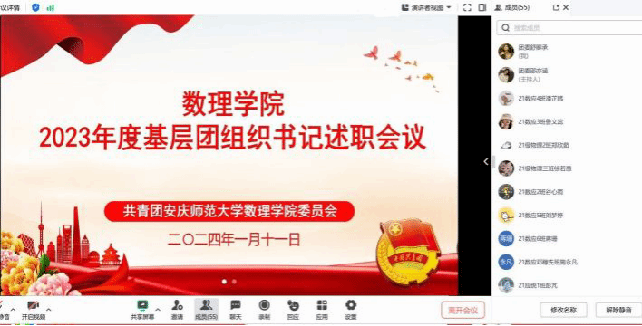 1月11日,数理学院召开2023年度基层团组织书记述职线上会议。学院党委副书记彭芳珍、团学负责老师、团学骨干和各班级团支书参加会议。