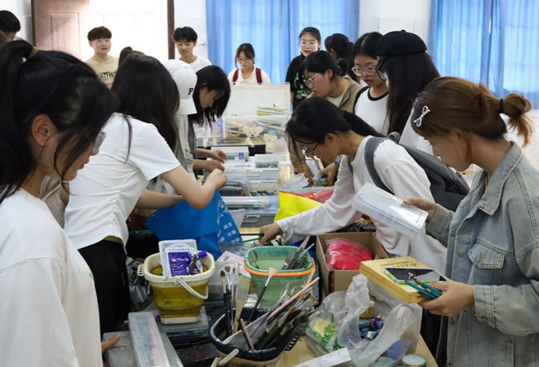 近日,美术学院开展“青春筑梦”资助育人项目系列活动之“旧物唤新生”活动。在资助育人工作室小组成员的装扮下,教室变成了热闹的“集市”,400余件包括颜料、画笔、刻刀等多种绘画材料吸引了众多学生前来挑选。