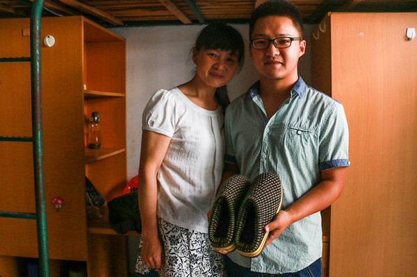 计算机与信息学院计算机科学与技术专业的胡浩然由母亲送到学校,在众多衣物和鞋子中一个塑料袋格外显眼,胡浩然打开袋子,里面装的是一双针脚细密、布料厚实的灰色针织拖鞋。原来,胡浩然的母亲在儿子上学前特意花了两天时间为儿子做了一双棉拖鞋。