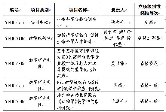 近日,省教育厅公布了2010年高等学校省级教学质量与教学改革工程项目名单(皖教高〔2010〕28号),生命科学学院在本次教学质量工程建设工作中取得了突破,共获立项5项,特别在省级实训中心和省级教学成果奖两类项目上,其中“生命科学实验实训中心”项目更是为学校在此类项目上实现零的突破,为此,生命科学学院付出了艰辛的努力。