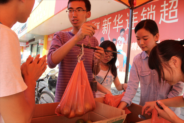 “亲爱的同学们,我们是‘怡养家园’项目的志愿者,我们的服务对象是失独老人。有一对老人家里种了200多棵橘树,家中只有这个经济来源。他们年事已高,已无法自己出售橘子。作为志愿者,我们在这里无偿义卖橘子,所得尽归二老所有。我们的橘子都是早晨刚采摘的,新鲜便宜,希望大家能够奉献爱心,多多支持。”10月13日下午,一张写着“义卖”字样的的海报,张贴在新华超市门口的一个帐篷上,帐篷里则是一边进行义卖,一边向同学们发出倡议的四名志愿者。