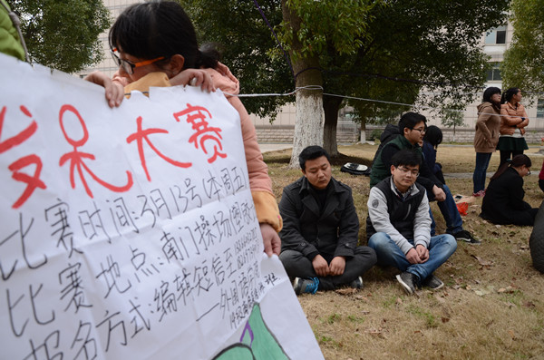 你平常发呆吗?你会发呆吗?13日下午两点,由外国语学院14商务英语1班和4班举办的发呆大赛在体育馆附近的草地举行。比赛吸引了学校内众多“呆萌”的同学前来参加。