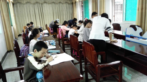从周一到周五每天下午四点二十分,不论天气如何,总会有志愿者在英语角集合然后步行前往大观区居委会。到达之后,每个人都会被安排一些任务,如烧开水、清扫教室、接孩子、辅导作业,任务有序地进行着。孩子们甜甜的一句“哥哥姐姐”就化解了志愿者们所有的疲惫。一位家长杨女士说:“我家小女儿在家写作业特慢,我和他爸每天上班到很晚,几乎抽不出时间接她,奶奶也管不住她,在这挺好的,你们还可以教她写作业,我挺相信你们志愿者的,安全问题我们也不用担心了。”杨妈妈还嘱咐志愿者:“千万要严厉点,还要有责任心。”