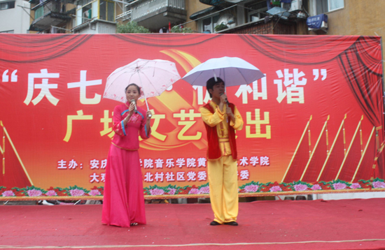该院结合学生专业实际,挑选了一组优秀的文艺节目,为花亭社区群众送上了一顿丰富的文化大餐。尽管天公不作美,但演员们的热情不减,一首首动听的经典红歌《江山》《红旗颂》以高亢炽热的激情,唱出了对党的无限热爱与忠诚,也表达了对党的89岁生日的深深祝贺,祝福祖国繁荣昌盛。黄梅戏表演专业的学生表演了社区群众喜闻乐见的黄梅小戏《闹花灯》《海滩别》《十五的月亮为谁圆》经典唱段,受到社区群众的热烈欢迎。