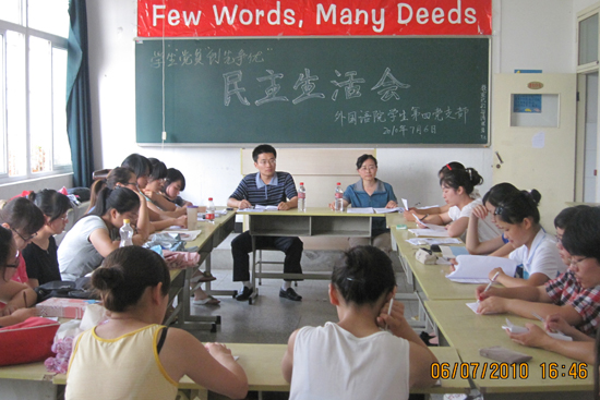 7月6日下午,外国语学院学生第四党支部在教学楼B104举行了学生党员“创先争优”民主生活会。该院党总支副书记王志红参加了会议,该支部第一批发展的党员、第二批拟发展对象以及列席的学生会主席等42人参加了会议,会议由该院团总支书记、学生第四党支部书记陈富泉老师主持。