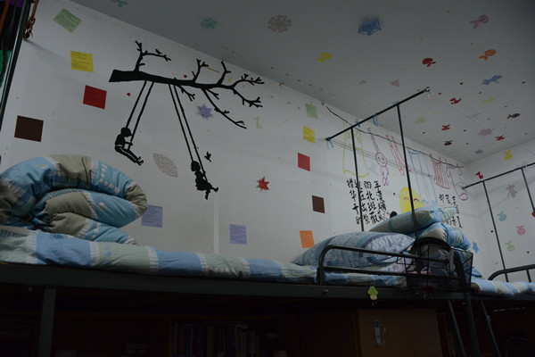 在安庆师范学院龙山校区2号楼A宿舍楼的511寝室,门上挂着一个“信箱,上面画着511寝室6个姑娘精心设计的室徽。推门一看,墙壁上整齐地贴了各样的剪纸,6个床铺对应的墙上画满了不一样的“壁画”,就连阳台门也贴上了一个个相框……“每年学校都会有‘寝室设计大赛’,我们寝室的装扮都是自己手工制作的,每一处都是自己个性的体现,很多处的设计都是废物利用。”寝室长孙秋阳说。