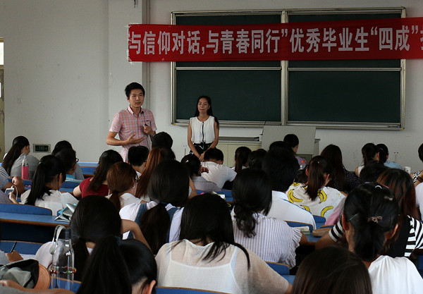 “你要相信你是什么样的,你就会遇到什么样的人。”考取伦敦艺术大学研究生的史阳琨站在讲台上和大家分享他一路走来的故事。6月24日下午,传媒学院举办“与信仰对话,与青春同行”为主题的优秀毕业生“四成”报告会。党总支书记陈秀、传媒学院团总支书记唐雪莲、7名优秀毕业生代表以及传媒学院学生参加此次报告会。