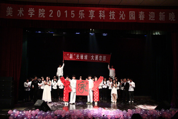 晚会以合唱《相亲相爱》结尾,礼仪手持红对联“福星高照”和“万事如意”分别站在左右两边。中间则是红底黑字书写的“家”,后面拉起了“新光璀璨,大展宏图”的横幅,体现了美术学院对新生的期盼,同时也展示了美术学院相亲相爱的院系氛围。(学生记者 张雨欣)