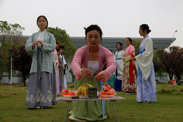 随着一声悠扬的二胡声响起,无我茶会告一段落。而汉服社迎接上巳节的另一项活动——祭祀高禖——也宣告开始。“高禖是古时管理婚姻和生育之神,而上巳节最早也是古人祈求生育与子嗣的节日。后来,上巳节逐渐演变成游春娱乐的节日,但祭祀高禖的传统却保留了下来。”虽然场地有限,资源有限,但祭祀仪式仍按古法进行的一丝不苟。“这是我们对古人的尊重,更是对传统的敬畏之心。”负责主祭的王同学说道。