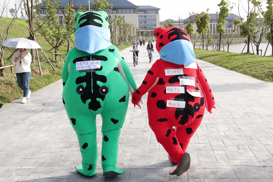 虽然天气炎热,人偶服厚重,但是扮演青蛙的同学依然乐在其中。“大家撕掉标签后,仿佛我自己的压力也被撕掉带走了。”工商管理类专业2022(2)班黄陈宇表示,穿上可爱的青蛙人偶服,摆脱了他的原有身份,在给大家带来乐趣的同时,他也得到了这份欢乐,收获了满满的成就感。