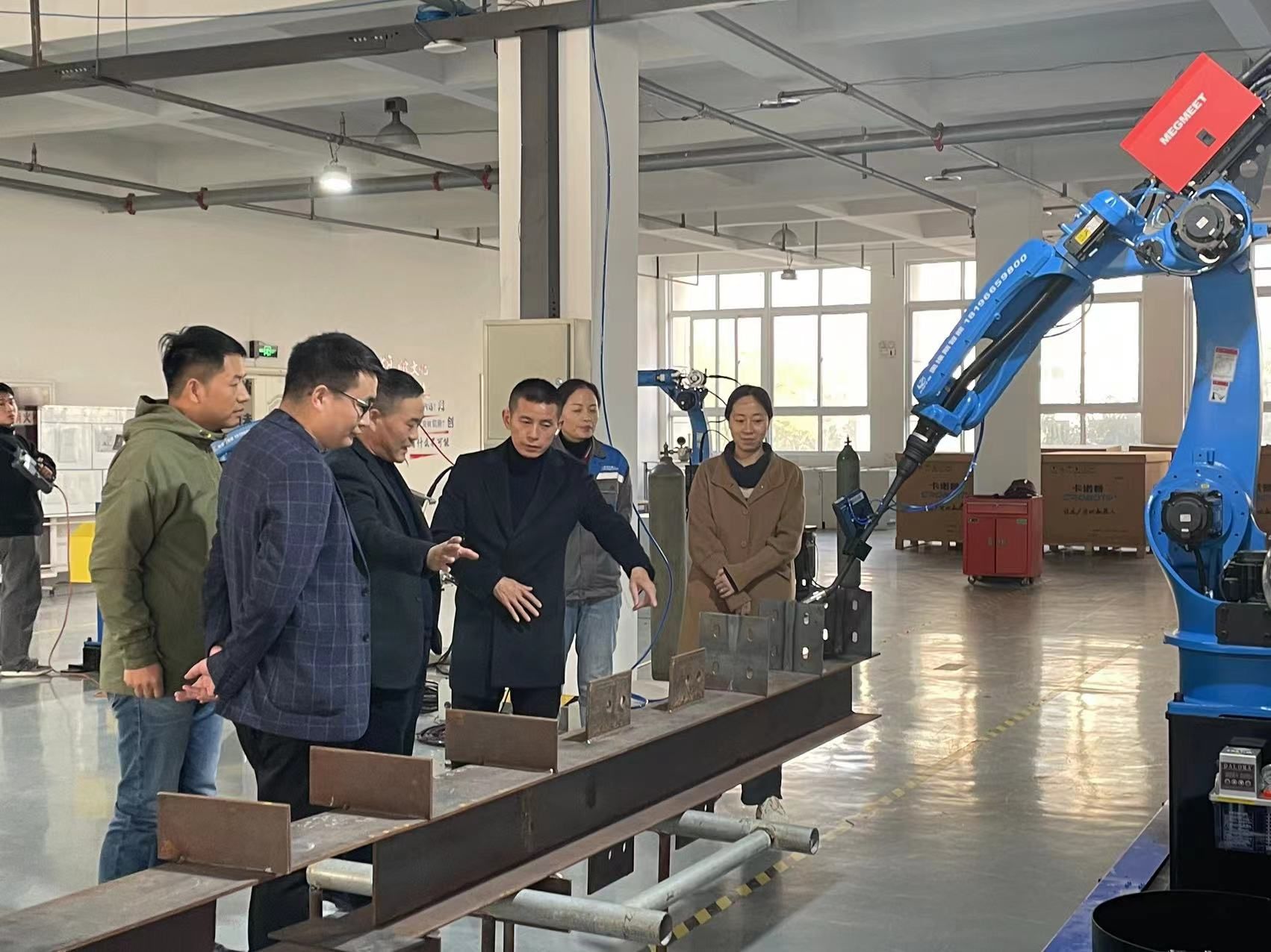 王远志一行实地参观了企业的研发中心和应用中心,观看了企业在机器人、机器视觉等领域的先进技术和工业应用。王远志介绍了学院基本情况和人工智能产业学院建设现状。他表示,现代产业学院作为“产教融合”的创新模式,通过引导高校面向区域、面向行业、面向产业办学,培养出发展所需要的特色型技术人才。产业学院将通过与企业的紧密合作,更好地满足社会对人才培养的需求,提高学生就业竞争力。通过校企联合招生,将课程内容、教学方式与生产实践对接,企业需要什么岗位的人才,学校订单式设置相关专业和课程。