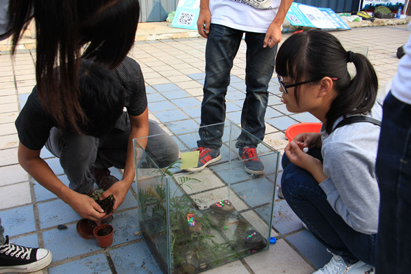 经过下午两个多小时的努力,大家自己动手制作的生态缸终于完成了。“大家以寝室为单位分组,我们小组的生态缸以田园风格作为设计基调。”生物技术专业的雷晨兴奋地向大家介绍道,“这里面有泥土、蚯蚓、苔藓,后种上小香樟树等绿植,还有湖水、金鱼。这些玩具房子,白色栅栏更为生态缸增添了不少乐趣。”