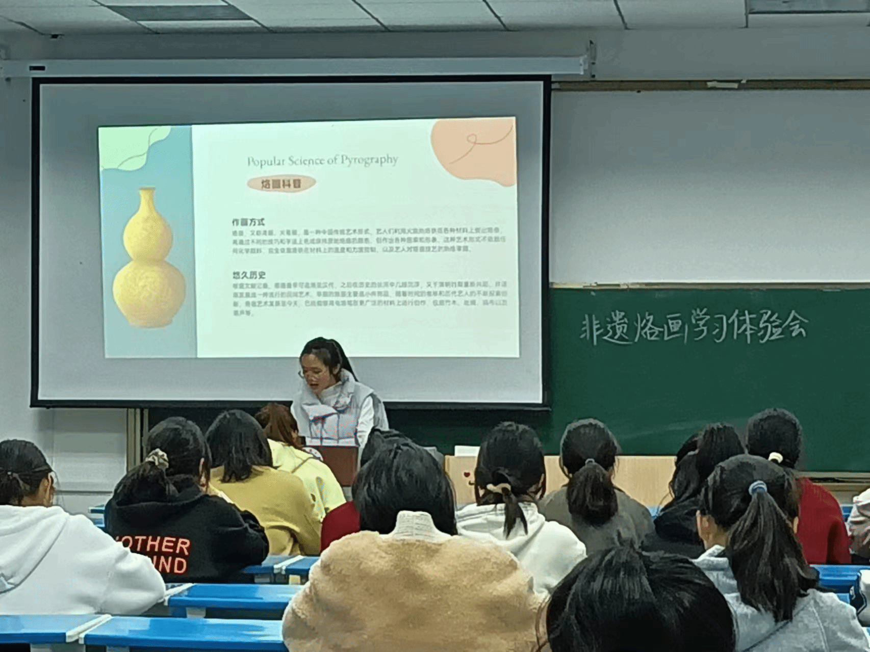 “烙画,又称烫画、火笔画,是一种中国传统艺术形式。”主持人运用图文、影像等方式,结合自身所学,生动形象地介绍了烙画的历史传承和作画方式,参与学生认真聆听、记录,并发表感想,进一步加深了对烙画的认识与理解。