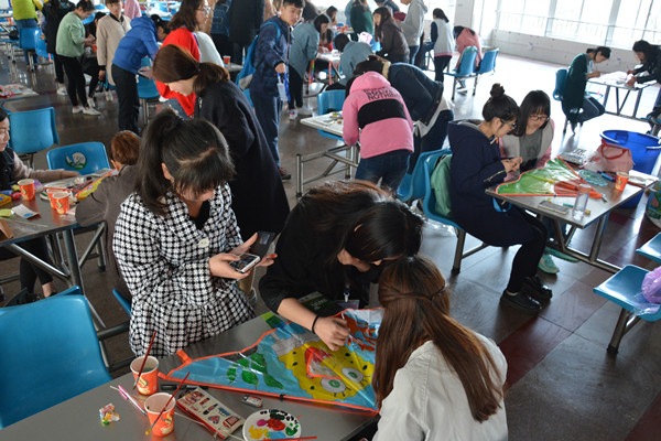 早在3月27日,风筝嘉年华大赛的参赛选手就来到后勤食堂二楼对风筝图案进行创作。执笔、染彩、点缀、勾勒……参赛的选手以小组为单位,开始自画风筝。比赛开始,不少小组拿出了自带的铅笔,开始勾画基本图形。15级小学教育专业的吴俊、朱悦、孙贝在自己的风筝上画上了祥云。在谈到画祥云的原因时,吴俊说:“奥运会也有祥云嘛,这个比赛是风筝大赛,说到风筝就联想到了蓝天、祥云,很漂亮。”在画风筝的过程中,三人分工合作,一人勾画基本图形,两人填色,创作过程有条不紊。