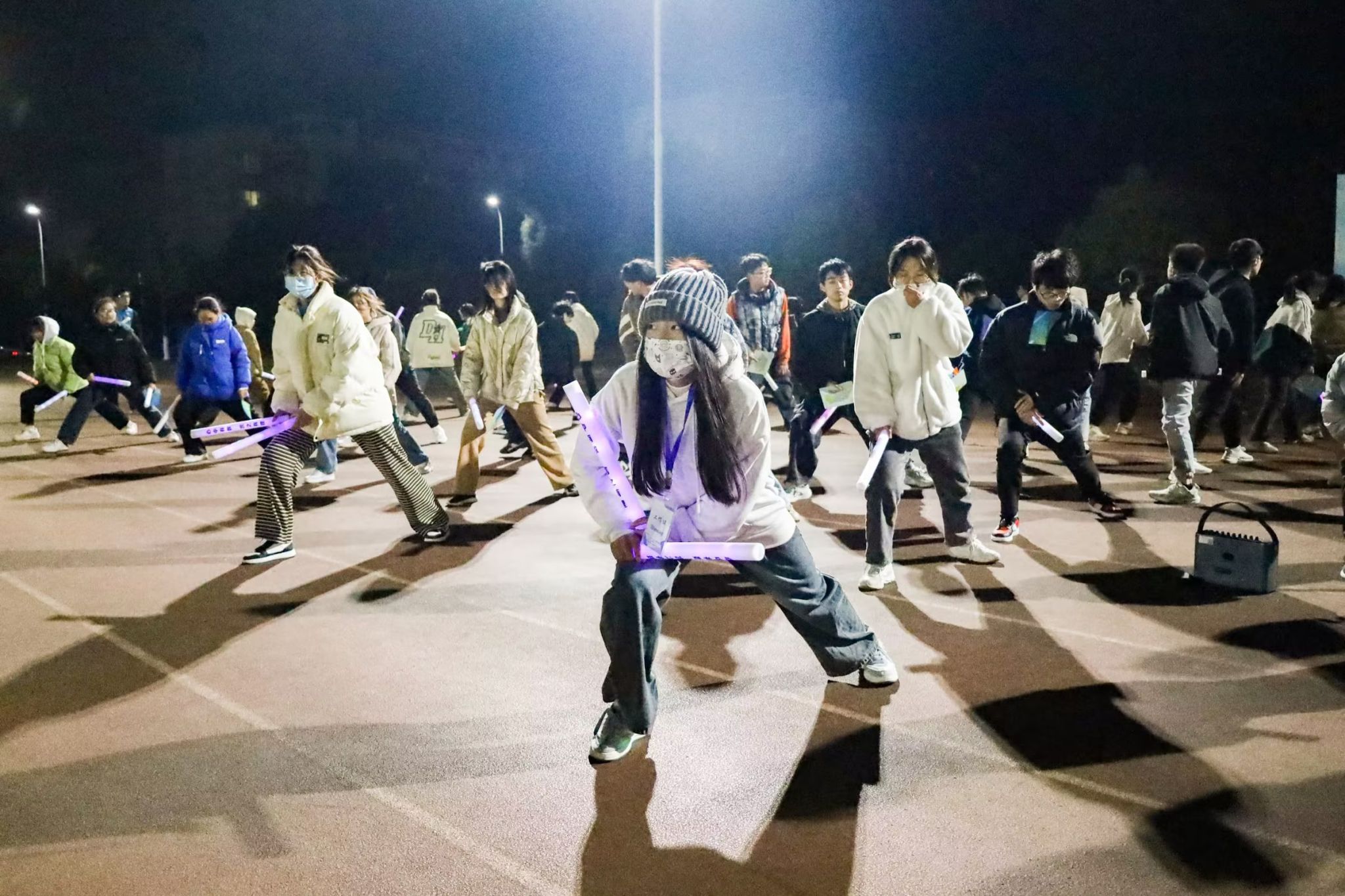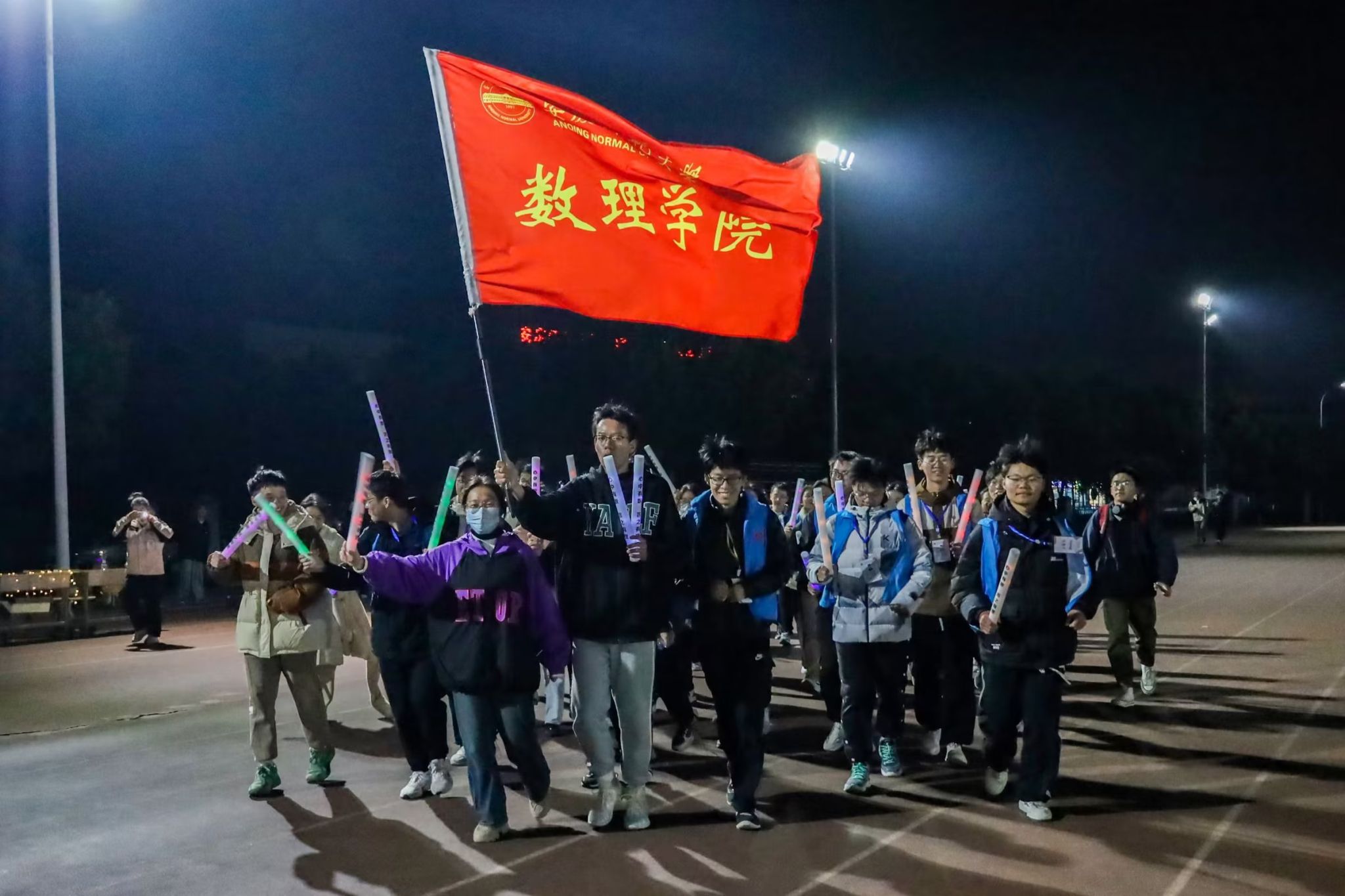 领取完集章卡后,伴随着节奏欢快的音乐,学生们纷纷做起了热身操。同时,数理学院团学指导教师为学生们讲解跑步流程,并提醒学生安全注意事项。当集体热身结束后,在20名学院师生组成的领跑团的带领下,学生们佩戴上荧光手环,手握彩色荧光棒,开启了绕校一周的“荧光之旅”。“冲呀!”“继续向前!”“一起跑!”……跑步途中,学生们挥舞荧光棒,相互打气助威,为学校的夜晚增添一抹亮色。