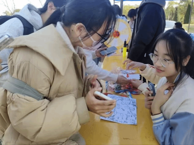 下午三点,春风和煦,景色宜人。同学们陆续来到活动现场,进行校园寻宝游戏以及二十四节气相关问题的问答。正值春分时节,万物复苏,同学们在校园里指定位置寻宝拍照打卡,在欣赏校园风光,感受春日美景之余,舒缓学业压力,放松紧张情绪,促进身心健康。
