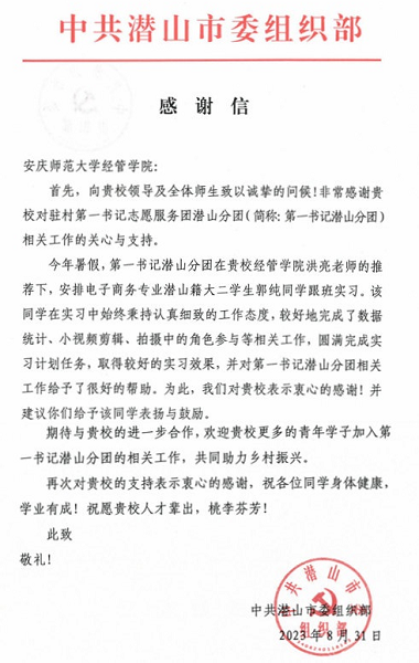 近日,潜山市委组织部向经济与管理学院发来感谢信,对学院选派电子商务专业学生协助该市打造“第一书记潜山分团”IP抖音号表达谢意,并提议学院对具体承担这项工作的郭纯同学进行表彰。