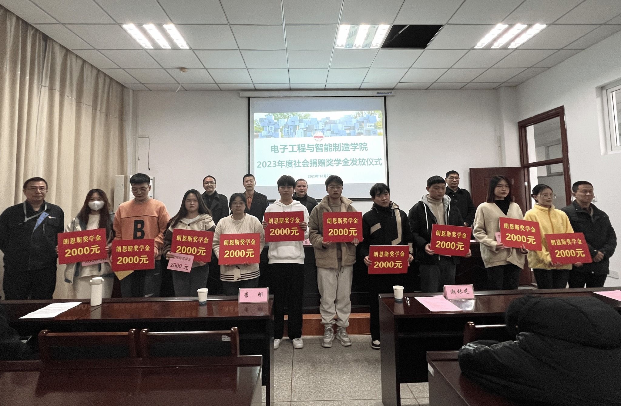 12月7日,电子工程与智能制造学院在稼先楼南104会议室举行学院2023年度社会捐赠奖学金发放仪式。江苏朗恩斯集团安庆思伟奇智能科技有限公司副总李宣、校友总会办公室副主任方申荣、学院领导班子成员出席仪式。班级辅导员、各班级学生代表以及2023年度社会捐赠奖学金获奖学生参加仪式。仪式由学院党委副书记高栋梁主持。