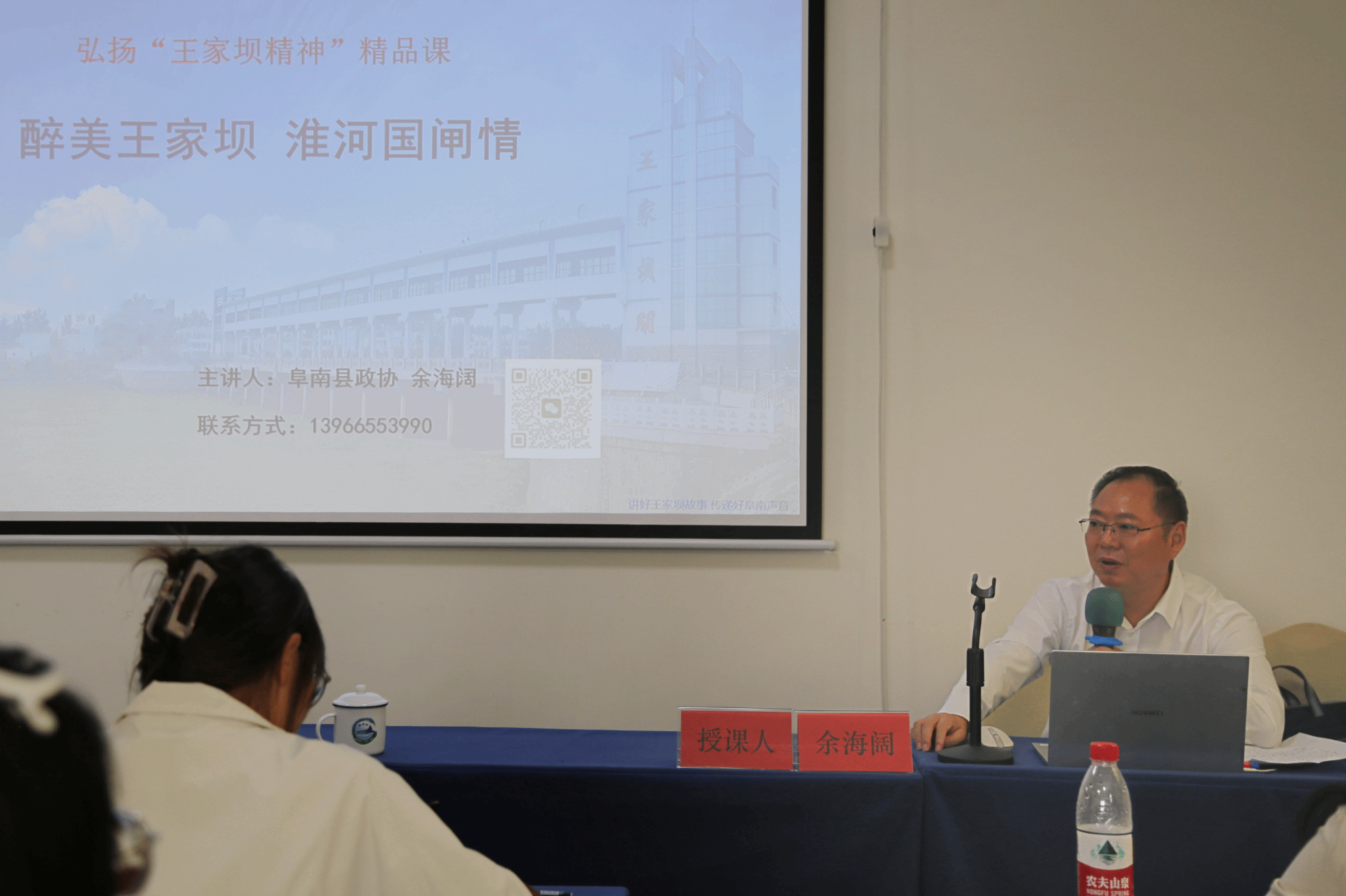 参观完王家坝抗洪纪念馆后,“延乔班”学生回到报告厅,学习“弘扬‘王家坝精神’精品课”。余海阔曾在王家坝镇工作十年之久,对王家坝镇了解、熟悉、感情至深,从“昔日溯源”“蒙洼新貌”“继往开来”三个方面深入讲解淮河的基本情况、王家坝精神的由来、王家坝精神的内涵和文化价值,学习苦难岁月时期感天动地的故事、在脱贫攻坚奋斗中对美好生活的向往,体悟人与自然和谐共生下的幸福生活。“不做水奴隶,要做水主人。”余海阔以自身实际工作经历直观展现淮河抗灾史、自救史、治理史,使“延乔班”同学深刻认识到没有中国共产党的坚强领导,没有党和人民的血肉联系,就没有一次次淮河防汛救灾的胜利,就没有全面建成小康社会的胜利。