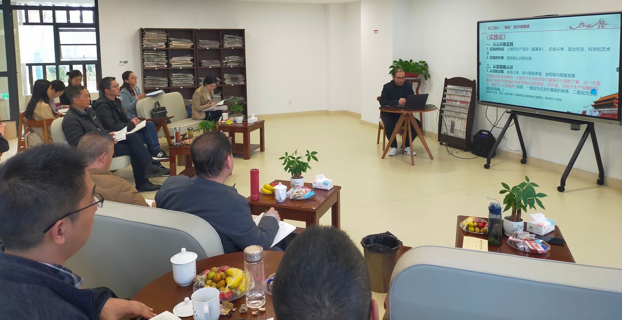 读书会上,学院青年教师汪金玉博士以“马克思主义哲学中国化奠基之作”为题,从创作背景、内容解读和当代价值等三个方面,对毛泽东的《实践论》和《矛盾论》进行了详细的介绍和深入浅出的讲解。在互动环节,青年教师围绕学习毛泽东这两篇经典哲学著作交流了心得体会。
