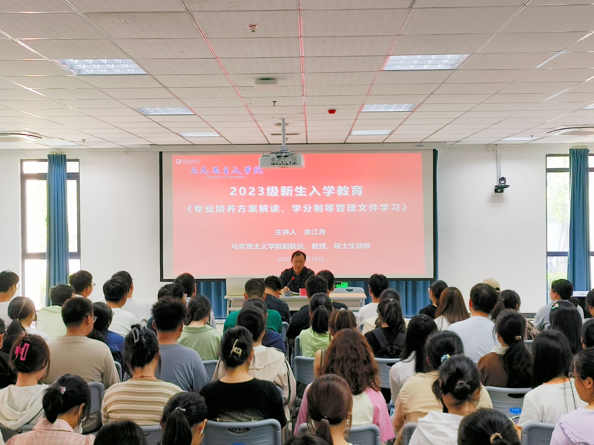 10月18日,马克思主义学院在Q119举办2023级新生入学教育报告会,2023级全体新生参加,报告会由学院副院长余江舟主讲。