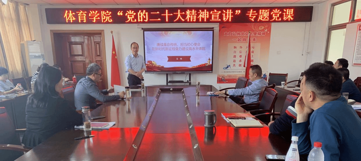 4月12日,体育学院在体育馆三楼会议室举办“党的二十大精神宣讲”专题党课。体育学院副书记、纪委书记王玮以“赓续革命传统,担当初心使命,在新时代新征程奋力建设高水平体院”为题,给学院全体教工党员讲授党课。