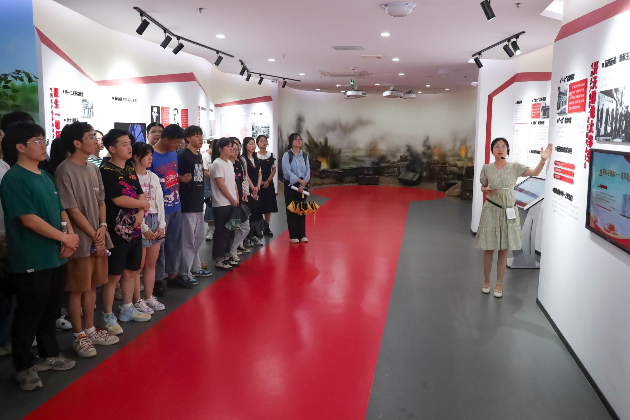 党建馆共有中共党史、学“习”区、锋领宜秀三个功能展区。步入党史展示区,学生党员们看到一艘缩小的红船模型,红船背后,投影仪投射的视频生动地再现了中国共产党诞生的场景。结合馆内的音频、影像等数字媒体技术,讲解员详细讲述党史、新中国史、改革开放史、社会主义发展史、中华民族发展史等知识,学生党员们深切感受中国共产党从诞生到发展壮大的百年历程。