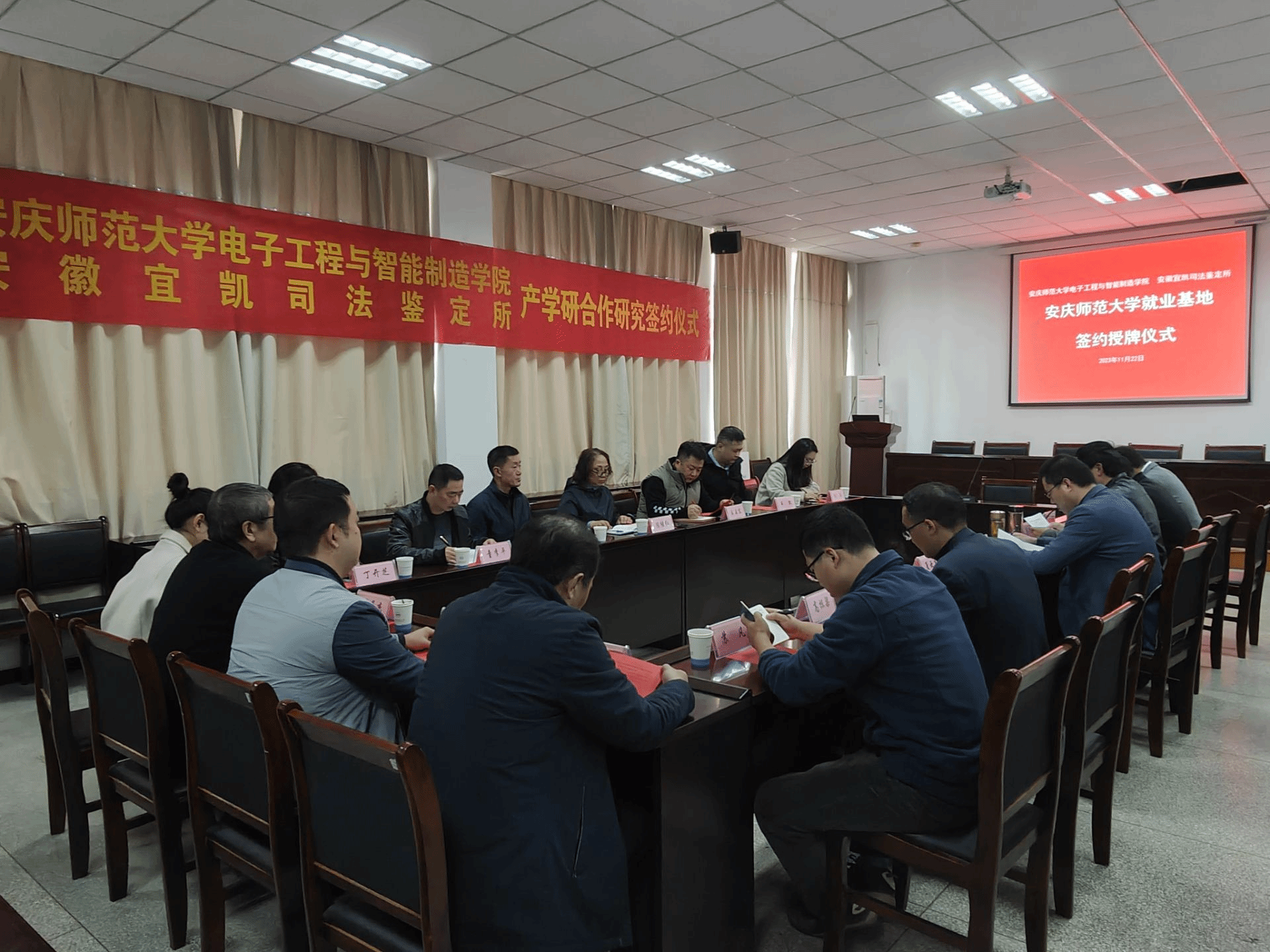 11月22日,学院在稼先楼南104会议室举办毕业生就业基地、实践教学基地签约暨授牌仪式。大别山区域发展研究院副院长查长礼,电子工程与智能制造学院党委书记夏云高、党委副书记高栋梁、副院长章礼华,安庆市司法局、安庆市交警支队、安庆市司法鉴定协会、安徽宜凯司法鉴定所等单位负责人参加仪式。仪式由詹文法主持。