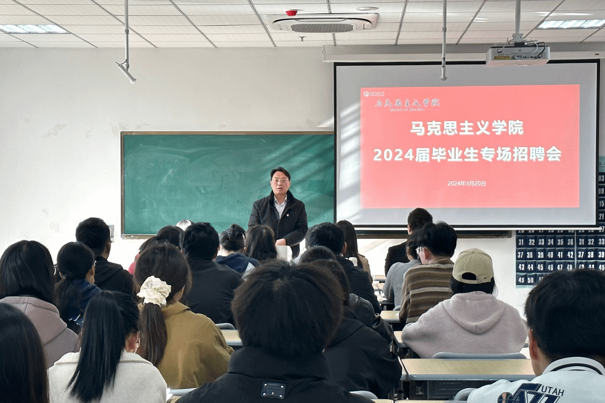 3月20日,马克思主义学院召开2024届毕业生专场招聘宣讲会。凤台精忠中学、安庆育才中学和合肥尚真中学等招聘学校到学院开展招聘宣讲,学院40余名毕业生参加。