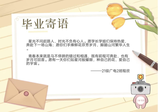 “星光不问赶路人,时光不负有心人。愿学长学姐们保持热爱,奔赴下一场山海。愿你们手捧鲜花芬芳岁月,脚踏山河繁华人生。愿有一天你们如星河般耀眼,种自己的花,爱自己的宇宙。”广播电视学专业2021(2)班程欣的寄语凝聚了她对毕业生们美好的祝愿。她表示,临近毕业季,看到许多学长学姐拍毕业照,很有感触。而此次活动的举办,能够为学生们表达对毕业生的祝福提供一个很好的途径,也激励着毕业生在未来披荆斩棘,逐风挽浪。