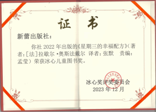 近日,2023年冰心儿童图书奖评选结果揭晓,外国语学院教师张默翻译的《星期三的幸福配方》荣获冰心儿童图书奖。该书由法国著名作家拉歇尔·奥斯法戴尔著,新蕾出版社出版。
