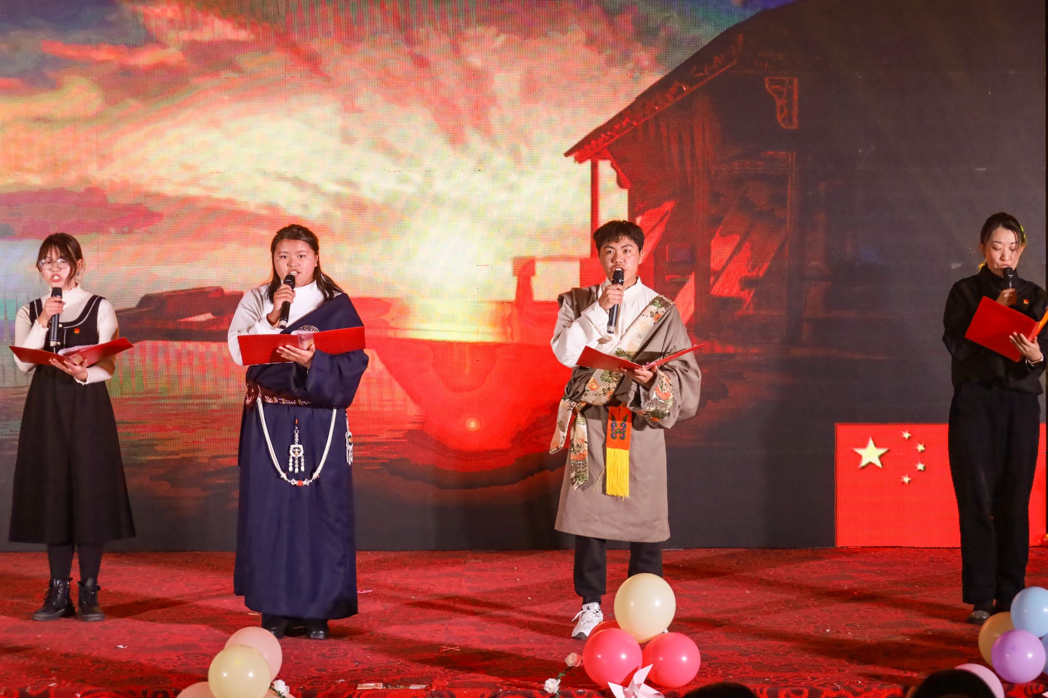 晚会分为“忆往昔·岁月如歌”“寻真理·梦想起航”“铸青春·灿烂成长”三个篇章,共12个节目。晚会从筹备到正式表演历经1个多月的时间,共有9种不同的各具魅力表演形式。“我们提前两个月就开始着手筹划本次晚会,经历多次规划、筛选、彩排等环节,以确保表演节目的质量。”晚会负责人之一、思想政治教育专业2022(3)班的姚志伟说。