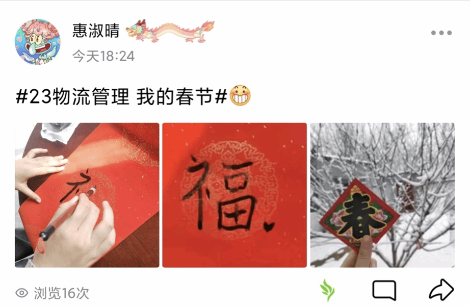 街边书法大爷提起毛笔,铺展红纸,挥毫泼墨,不一会儿,一副对联就完成了。辞旧迎新绝对少不了写对联、贴春联,物流管理专业2023(1)班的张思玉同学虽然没有练过书法,但她也在红纸上写下了一个“福”字。“长辈们用庄重虔诚的笔画写下平仄相协的对联,在感受汉字文化中寄望来年好光景”,张思玉如是说。